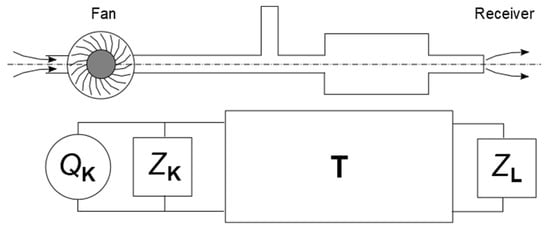 36]. At constant speed, the ventilation system fan drives an air volume flow through the ventilation ducts. The volume flow has a non-zero mean value and a superimposed pulsating part caused by the fan blades. At constant speed, the pulsating part causes a tonal acoustic noise. The mean flow itself generates a wide-band random character noise caused by turbulent vortex shedding in the boundary layer between the air flow and the duct walls, and at the fan blades. At specific flow conditions, some components can generate a whistling noise. All these sound generating mechanisms cause volume flow disturbances that radiate acoustic noise from the duct outlet to the receiving environment.