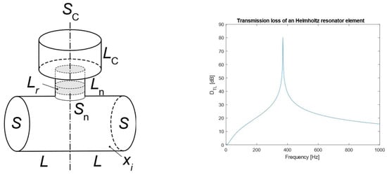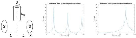 Step 3 is carried out by investigating the transmission loss for the available silencer elements (quarter-wavelength resonator, Helmholtz resonator, and expansion chamber). In this way, it is possible to make an estimate on which elements to apply, especially when it is necessary to have a high transmission loss at more than a single frequency. In this case, it is interesting to note that while a quarter-wavelength resonator expresses a high