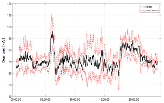 Figure 1 displays the average values and standard deviation of the daily demand curve for the installation site, with one-minute resolution. The greatest variability of the curve is located outside peak hours, with a standard deviation in the range of ±18 kW. During peak hours, between 6 p.m. and 9 p.m., the standard deviation drops to approximately ±7 kW.