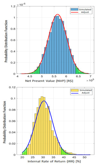 Figure 3 shows the histogram and the referred normal distribution curve adjusted to the histogram. The normal distribution graph displays a green region that represents a 95% confidence interval, i.e., 95% of all results are located out of the green-marked area. The average value of the NPV is equal to BRL 564,470 (USD 137,675.61), with a standard deviation of BRL 37,730 (USD 9202.44), and its confidence interval (95%) ranging from BRL 490,500 (USD 119,634.15) to BRL 638,400 (USD 155,707.32). The average value of the IRR is equal to 30.45%, its standard deviation of 4.16%, and its confidence interval (95%) varies from 22.28% to 38.62%.