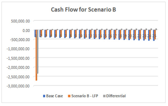 The cash flow for the first year has an average value of BRL 2,344,014.37 (USD 571,710.82), higher in comparison to the Diesel Generator scenario (Scenario A). The average cash flow for the first year is 80.75% higher in comparison to the scenario for a Diesel Generator implementation, but the differential cash flow is 3.43% lower at the end of the lifecycle due to capacity loss and efficiency of the BESS.