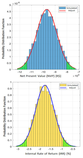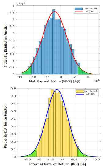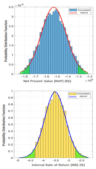 Figure 7 represents the histogram for this scenario. The average value of NPV for the solution is equal to −BRL 843,680.00 (USD 205,775.61), with an standard deviation of BRL 87,330.00 (USD 21,300) and confidence interval (95%) that starts at −BRL 1,015,000.00 (USD 247,560.98) and ends at −BRL 672,000.00 (USD 163,902.44). The average value of IRR is equal to −1.24%, standard deviation is 0.45%, and confidence interval (95%) ranges from −2.12% to −0.35%.