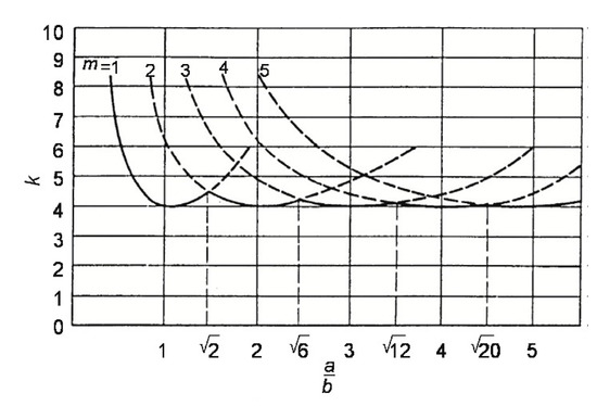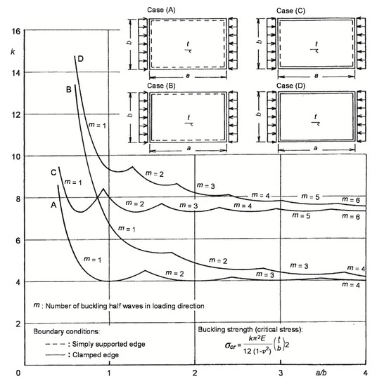 where can be determined using Equation (2). a and b are unloaded plate length and loaded plate length, respectively. is the buckling coefficient where the value depends on the aspect ratio a/b and the type of the supports on the plate edges (boundary condition). The plot of the buckling coefficient versus the aspect ratio a/b is shown in Figure 2.