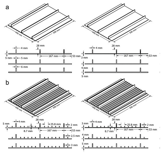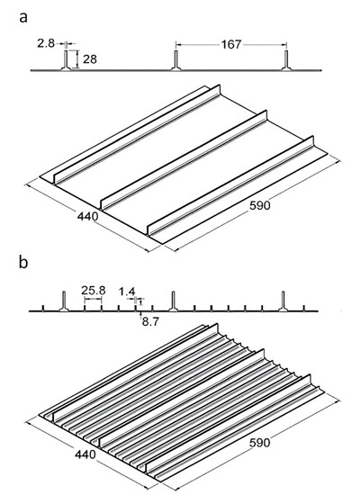 A series of experimental buckling tests of stiffened panels were carried out by Quinn et al. [41]. There were two specimens used in the experiment. Figure 4 shows the specimen geometry and the dimension. One specimen has a configuration of three longitudinal stringers with a length of 590 mm each placed on the surface of the plate. It has a height of 28 mm and a 2.8 mm thickness. Three longitudinal stringers were arranged parallel to each other at a distance of 167 mm. The other specimen has a five blade section of sub-stiffeners placed between the longitudinal stringers. They have a height of 8.7 mm and a thickness of 1.4 mm each, Figure 4b. The plate thickness of Specimen A and Specimen B were 2.2 mm. Both specimens were manufactured with Aluminium Alloy 2024-T351.