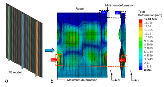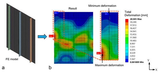 The finite element model of Specimen B with the shell elements is presented in Figure 7a, and total deformation is presented in Figure 7b. The maximum deformation of Specimen B is located on the left edge of the plate. A moderate level of deformation can be seen in the center of Specimen B. There was no deformation on the top edge. Slight deformation is presented on the bottom edge.