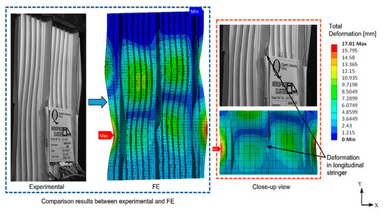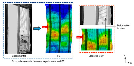 Figure 8 shows the comparison results between the experimental and finite elements (FE). Compared with the experimental data, the deformation in Specimen B was quite similar. As is evident, a slight deformation occurred in the sub-stiffener. There was deformation in the center of the longitudinal stringer, as pointed out by the arrow in Figure 8. This deformation can be seen in both the experimental data and FE result.