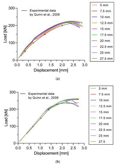 Load versus displacement curves based on comparison with laboratory experiment by Quinn et al. [41]. (a) Specimen A and (b) Specimen B.