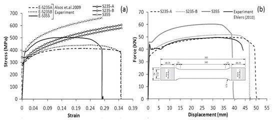 The materials used in this study were mild steel (S235JR-EN10025) and high strength steel (S355JR-EN10210). The material properties are described in Table 6 and were obtained experimentally by [47,48]. A comparison of the engineering stress-strain curves and true stress-strain curves is shown in Figure 12a. These materials were widely used in naval architecture and marine engineering [49,50]. All three materials have a density of 7800 kg/m3, a Young’s Modulus of 210 GPa, and a Poisson’s ratio of 0.3.