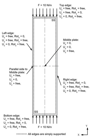 For thin rectangular plates under a compression load (Figure 1), buckling happens when the applied load reaches a certain critical value. For simply supported rectangular plates on all sides, as shown in Figure 1, the critical buckling load is given by [1,23]: