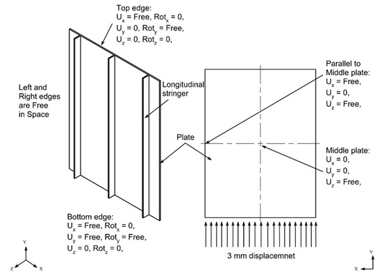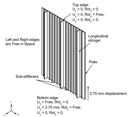 In this study, experimental buckling tests of stiffened panels performed by Quinn et al. [41] were modeled using nonlinear finite element analysis. The analysis was carried out using the commercial FE package ANSYS [42]. Specimen A and Specimen B, alongside longitudinal stringers and sub-stiffeners, were re-created using the shell element. The deformation (plastic) and the load versus displacement will then be compared with the experimental results.