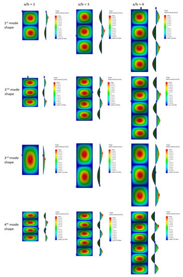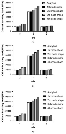 It is a fact that the a/b ratio of the specimen affects the number of half-wavelengths and the critical buckling load [1]. This fact also can be seen in the simulation with the finite element in this study (Figure 16 and Figure 17). In particular, all the buckling deformation patterns that are shown in Figure 16 exhibit cartesian symmetry. This behavior is due to the fact that the structural system under consideration is symmetric and the material is isotropic, as described by Zucco and Weaver in “The role of symmetry in the postbuckling behaviour of structures” [52]. A total number of two, three, and four half-wavelengths appear in the 1st mode shape of the specimen with an a/b ratio of 2, 3, and 4, respectively. The 1st mode shape gives remarkably good agreement of the critical buckling load compared with the analytical calculation (e.g., the error is not more than 0.02% for the a/b = 2 and 4, and 0.1% for the a/b = 3 compared with the analytical). In the case of plate thickness, it severely affects the value of the critical buckling load, but the reverse is true for the number of apparent half-wavelengths. For instance, the 3 mm thickness of the plate produces the critical buckling load of 20,498 N/m, 81,994 N/m, and 20,498 N/m for aspect ratio a/b = 2, 3, and 4, respectively. These three values are increased exactly by 362.97% compared to 5 mm plate thickness, which is 94,900 N/m, 379,600 N/m, and 94,900 N/m. However, the thickness of the plate seems to not affect the number of half-wavelengths.