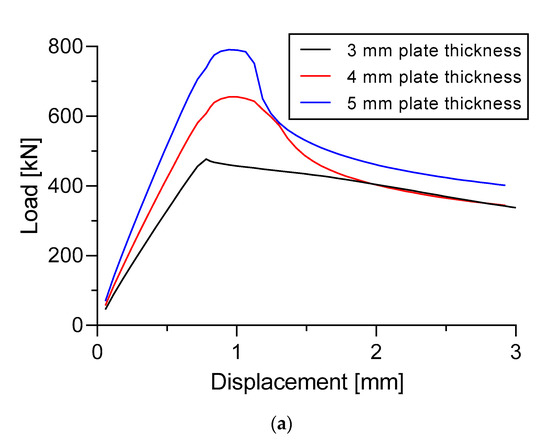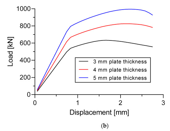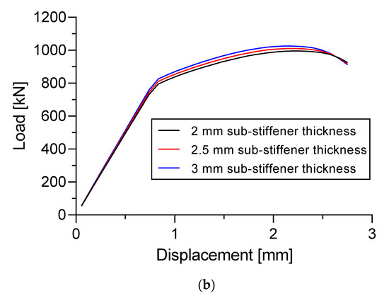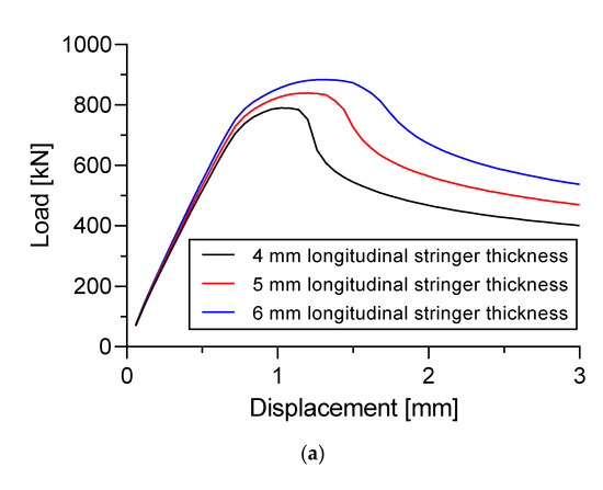 The load versus displacement curves of three different materials in Specimen A is presented in Figure 27a. The dimension of the specimen was fixed to 5 mm plate thickness and 4 mm longitudinal stringer thickness. Figure 27b shows the load versus displacement curves of three different materials in Specimen B. The dimension of the specimen was fixed to 5 mm plate thickness, 4 mm longitudinal stringer thickness, and 2.5 mm sub-stiffeners thickness.