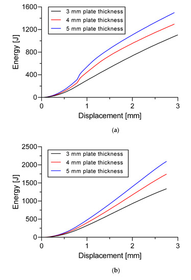 Table 10 and Table 11 show the total energy produced during the buckling process along with the ELT ratios. It was found that the S355JR-EN 10,210 material had the highest total energy compared with the S235JR-EN10025 (B) and S235JR-EN10025 (A) materials. In Table 10, the highest ELT ratio difference in total energy was found in Specimen B with a plate thickness of 5 mm. The total energy was 6.98% higher in the ELT ratio 6 compared to the ELT ratio 5. This difference in value occurred in the S355JR-EN10210 material.