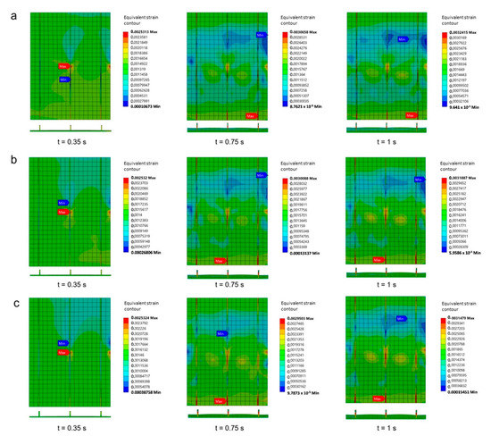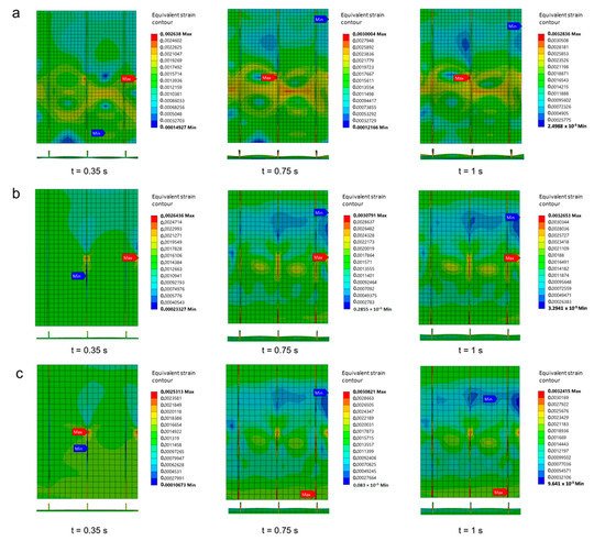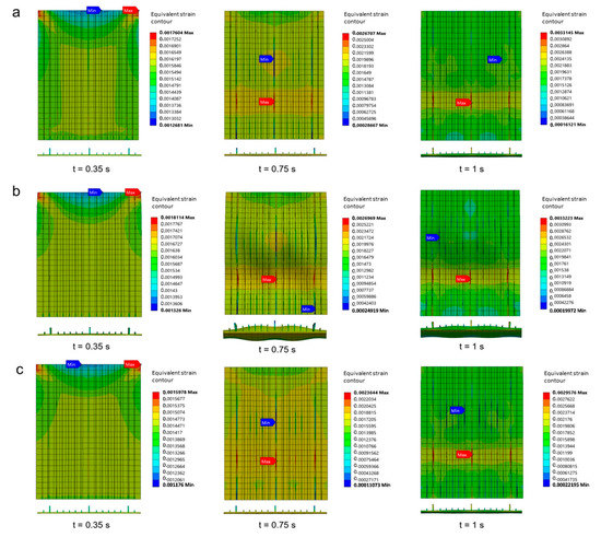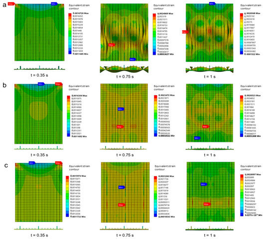 There is an increase in ultimate buckling collapse load if the thickness of the longitudinal stringers is increased, as was the case in Specimen A. The thickness of the longitudinal stringers in Specimen A moderately affected the strength of the stiffened panels (Section 8.2). This is also supported by the existence of a different strain distribution when the thickness of longitudinal stringers changes, for example, when the thickness is 6 mm which gives a quite small deformation compared to the thickness of 4 mm and 5 mm (Figure 24). In the case of 6 mm thickness, the stiffened panel increased its strength by 6.18% and 11.8% compared to the thickness of 5 mm and 4 mm, respectively. The values obtained from these thicknesses are 884.0 kN, 839.6 kN, and 790.7 kN, respectively. These thicknesses also seem to moderately affect the total energy in Specimen A. Less total energy was produced when the 4 mm thickness was applied which was 1499.7 J. Slightly more energy was provided when the 5 mm and 6 mm thickness was applied which was 1727.7 J and 1927 J respectively.