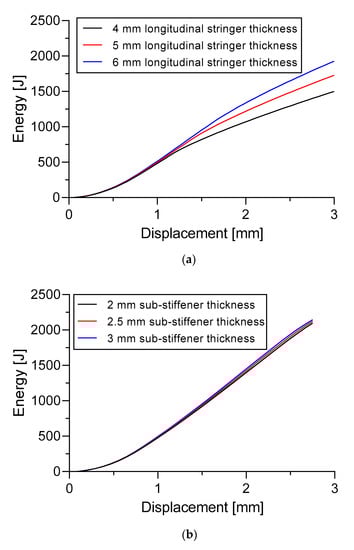 On Specimen B, five blade section sub-stiffeners were attached between the longitudinal stringers. Three different thicknesses of sub-stiffener were proposed: 2 mm, 2.5 mm, and 3 mm. The thickness of the plate and longitudinal stringers was fixed to 5 mm and 4 mm when the change in the sub-stiffeners thickness took place, respectively. The thickness of the longitudinal stringers and sub-stiffeners were fixed at 4 mm and 2 mm when the change in the thickness of the plate took place, respectively. The effect of these changes in terms of the thickness on the load versus displacement curves and the generated energy was compared.