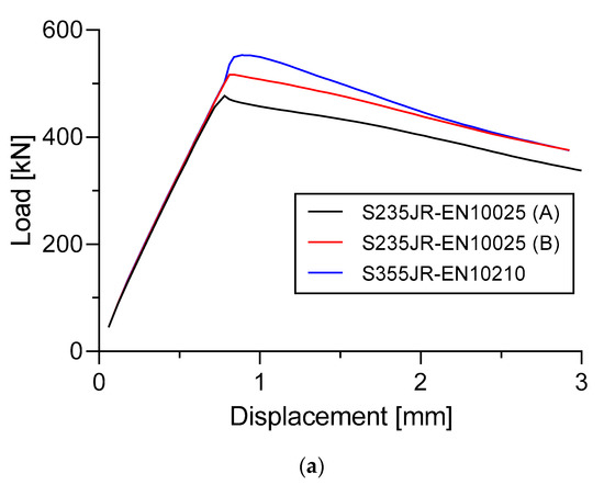 It can be seen in Figure 26 that the S355JR-EN10210 material has a moderately higher ultimate panel collapse load compared with the S235JR-EN10025 (B) and S235JR-EN10025 (A) materials. This incident was found in Specimen A and Specimen B.