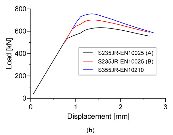 In Specimen A, the ultimate panel collapse load value on the S355JR-EN10210 material was 553.1 kN. Moreover, the materials S235JR-EN10025 (A) and S235JR-EN10025 (B) were at values of 477.2 kN and 516.9, respectively. It was found that the material S355JR-EN10210 gave the ultimate panel collapse load values that were 15.91% and 7% higher than the material S235JR-EN10025 (A) and S235JR-EN10025 (B), respectively. In Specimen B, it was also found that the S355JR-EN10210 material had 19.48% and 7.9% higher ultimate panel collapse load values compared to S235JR-EN10025 (A) and S235JR-EN10025 (B), respectively.