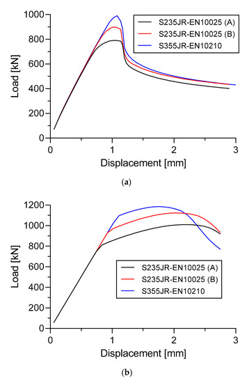 Effect of materials change to the load versus displacement curve. (a) Specimen A; (b) Specimen B.