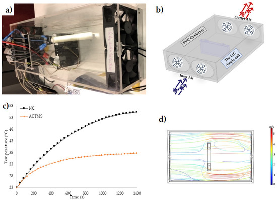 (a) The experimental test bench of the air-cooled system for the 2300 F LiC; (b) the 3D model; (c) comparison of the results where there is not any TMS (NC) by the air-cooled TMS (ACTMS); (d) the streamline of velocity [16].