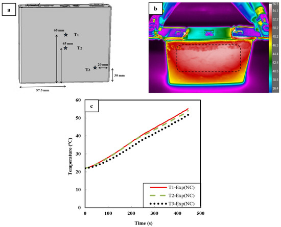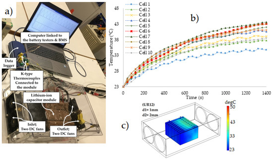 (a) The experimental test bench of the air-cooled system for the LiC module; (b) the temperature evolution of 10 thermocouples on different positions of the module; (c) the temperature distribution of the module in the most optimal case study [18].