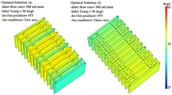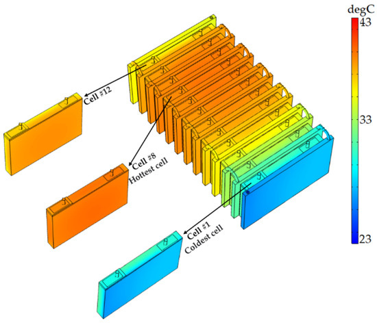 In another work, they investigated a liquid cooling method for LiCs. The module consisted of 12 LiCs in series connection [28]. Figure 6 illustrates the main case study before optimization cases, with temperature reduction from 70 °C to 40.3 °C. The uniformity of the hottest and coldest cells is 9.1 °C, which is not favorable. Therefore, some optimization cases should be designed to reduce the temperature difference. Enhancing the inlet flow rate from 100 mL/min to 1000 mL/min reduced the maximum temperature to 33.2 °C with a 5.1 °C temperature difference. Moreover, by enhancing the fluid temperature from 23 °C to 40 °C, the impact cannot affect the maximum temperature, but the temperature uniformity reached 1.4 °C. In addition, changing the inlet and outlet positions had a good influence on the temperature. Moreover, the number of arcs per tube has been evaluated, for which three arcs per coolant pipe has been selected as the optimal case. In the end, by optimizing the mentioned parameters, the maximum temperature has been maintained below 38 °C, with uniformity of 2 °C. Figure 7 exhibits the temperature distribution of the optimal scenarios.
