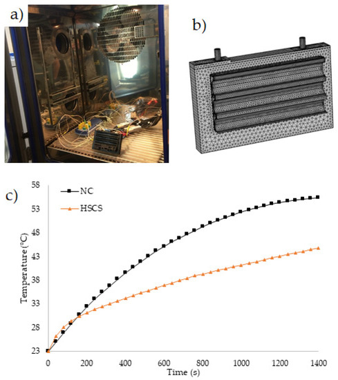 (a) Experimental test bench of the heat sink cooling system (HSCS) for the LiC cell; (b) 3D model and mesh generation of the system; (c) temperature evolution of the heat sink cooling system (HSCS) compared with the natural convection (NC) [34].