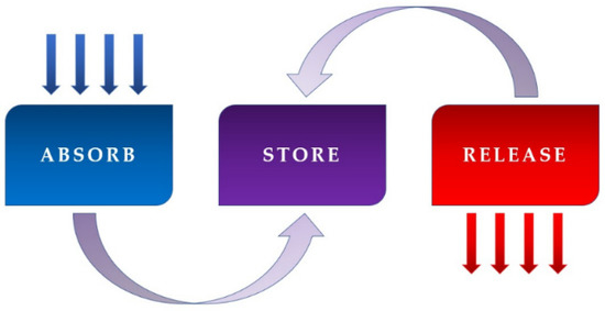 Phase change materials (PCMs) absorb thermal energy during the phase transition from the solid phase to the liquid phase with minimal temperature rise [40]. The latent heat is higher than the sensible energy stored thanks to the material’s specific liquid or solid phase heat [41]. The latent heat of fusion of PCMs is quite high, which leads to absorbing a high amount of thermal energy while retaining a constant temperature [42]. During the PCM’s phase change, the specific heat would be increased when it starts to be melting from the solid state. Figure 9 illustrates the working principle of PCMs.