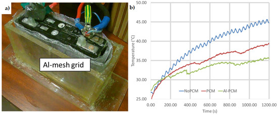 (a) Experimental test bench of the PCM-Al mesh grid; (b) the results of three case studies including no-PCM, pure PCM, and PCM-Al [47].