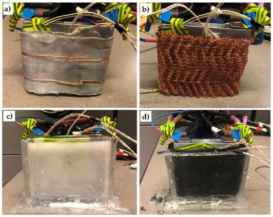 PCMs’ maintenance is not required because they do not have any moving parts. Moreover, there is no external energy source for PCMs to work. Paraffin is the most employed material as the PCM due to its valuable advantage of having a long life since paraffin is chemically compatible with metals [43]. The concept of using PCMs as TMS in batteries for the first time was presented by Al-Hallaj et al. [44]. Gradually, the excellent properties of PCMs for the thermal management of batteries have been revealed [45]. Karimi et al. [46] employed a paraffin-based PCM for a dual cell module of LiCs. The proposed passive system decreased the maximum temperature of the module by 26%, in which the temperature reduced from 55.3 °C to 40.8 °C. Moreover, they used an aluminum mesh grid foil to increase the thermal properties of the PCM, and thus the temperature was reduced to 36.2 °C. Figure 10 illustrates the employed PCM for the LiC technology.
