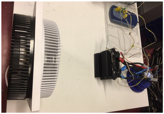 Heat sinks are passive heat exchangers with the ability of heat removal by transferring it to the ambient. The heat removal process is performed by enhancing the heat flow away from a heat source. For battery modules/packs, heat sinks are not good candidates due to the low heat transfer rate. However, they can play a significant role in batteries’ heat removal as secondary material in hybrid TMSs. The number of research items investigating heat sinks alone as a cooling solution for LiCs and lithium-ion batteries is not extensive. However, some of them are summarized in this section. In the only research item for LiCs considering the usage of heat sinks as the proper TMS, an LiC cell is surrounded by two novel heat sinks in high power applications [34]. The experimental test bench and the numerical 3D model are shown in Figure 8. Such a passive TMS reduced the maximum temperature by 18.9%, which is a good performance. However, this reduction trend proves that, if heat sinks are used combined with the other TMSs, the results would be better.