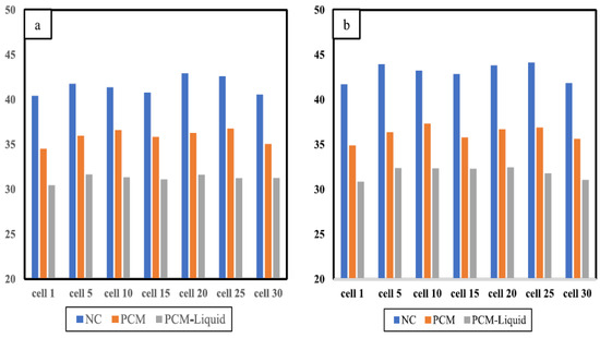 Jaguemont et al. [47] used a paraffin wax for LiC cooling system and defined three case studies, including natural air (zero-strategy), cooling with PCM, and cooling with PCM-Al (Figure 11). They showed that enhancing the thermal conductivity of the PCM is of high importance since PCMs can absorb the generated heat easily, but they have problems rejecting the absorbed heat to the ambient. However, almost all PCMs suffer from low thermal conductivity. Therefore, many researchers targeted to overcome this issue by using different methodologies. Therefore, other high conductive materials such as heat pipe [48], graphite [49], nanomaterials [50], nanofluids [51], copper foams [52], or aluminum foams [46] should be added to PCM to cope with this drawback. Table 1 lists the summary of the composite PCMs in the literature.