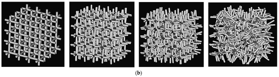 | Perturbation | Node | Spatially random distribution | Simple cubic and Kelvin lattices | Reduction in anisotropy for simple cubic; moderate reduction in Young’s modulus in all directions for Kelvin [45] |