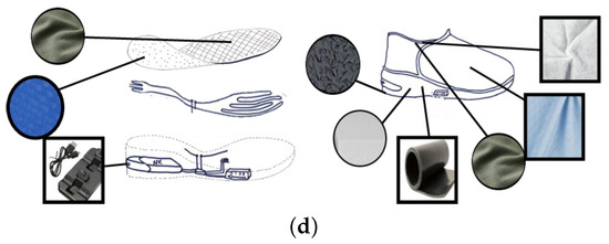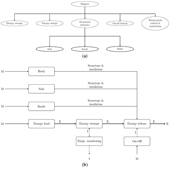 Figure 1a illustrates the proposed physical decomposition in the following elements: 1. the energy storage element; 2. the energy charging element; 3. the structural elements including the sole, insole and upper of the slippers; 4. the on–off switch element; and 5. the temperature control and monitoring system. Figure 1b shows the functional decomposition. The product includes several elements (sole, insole, and upper) used for structure and insulation (avoid energy loss). In addition, flows of information connect the on–off element with the energy release element to characterize the action of heating, and the temperature monitoring element with the energy storage element to characterize the action of measuring and display of the physical signal in a convenient scale.