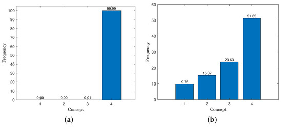 Frequency of dominance of concepts (in %) obtained varying (a) the weights with ; (b) the scores . Legend: Concept 1—Reference; Concept 2—Techno Slipper; Concept 3—Star Slipper+; Concept 4—Diamond Slipper+.