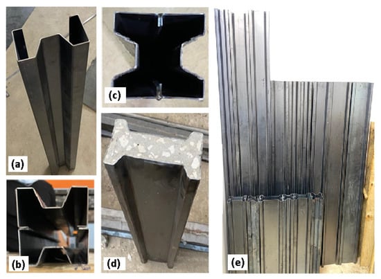 Specimens manufacturing process (a) Forming sigma sections, (b) assembling column section, (c) welding the two stigmas, (d) casting concrete and (e) all fabricated steel shells.