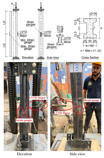 Each specimen was equipped with two strain gauges at mid height of the column on the 100 mm width faces measuring the maximum and minimum axial strains due to concentric and eccentric loads. In addition, two LVTDs were used to measure the lateral deformations at mid height of the column in both major and minor directions of the cross section. Finally, the testing frame is equipped with a load cell to measure the applied load. Figure 3 illustrates test setup and instrumentation.