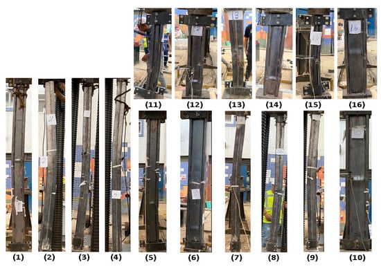 - The lateral deformation due to global buckling (in a minor direction) is estimated for each specimen using Equation (2):where (λ) is the fully bonded composite global slenderness ratio. If the measured Δ-minor was near or more than this value, that indicated global buckling failure.
