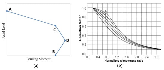 (a) Typical interaction diagram of EN-1994. (b) Buckling reduction factor of EN-1994.