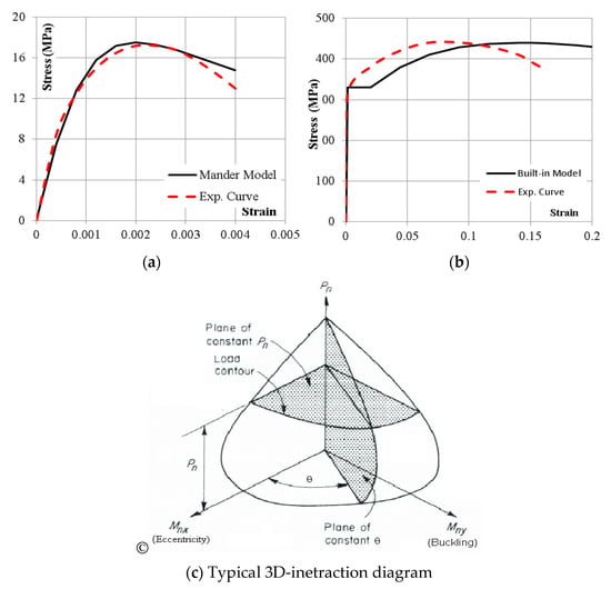 A 3D-interaction diagram (PMM-interaction diagram) was generated for each specimen using the well-known CSI-COL Ver. 6.2 software considering the built-in Mander model for unconfined concrete behavior and the built-in structural steel model. The stress–strain curve of the Mander model [22] is automatically generated for certain (fc’ and Ec) values, while the structural steel model requires (Fy and Fu) to generate the stress–strain curve. Figure 6 presents both the generated and the experimental stress–strain curves for steel and concrete and a typical 3D-interaction diagram.