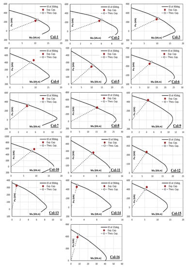 In order to present both experimental and theoretical capacities graphically as shown in Figure 7, a certain section in the 3D interaction diagram is constructed. The angle of this section (θ) depends on the value of eccentricity moment (Mmajor = P × e) and buckling moment (Mminor = P × Δminor), as shown in Equation (9):