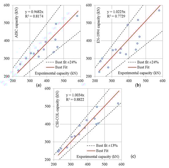 Figure 9. Comparison between both experimental and theoretical capacities. (a) Using AISC-LRFD, (b) Using EN-1994, (c) Using CSI-COL software.