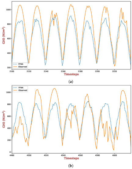 Long-term GHI forecasting has been slightly studied in the literature until now. In this work, we propose a new approach to feed two deep learning models to face this task: feed forward neural networks and recurrent neural networks. For each technique, a single model was trained in a very short computational time (less than 3 s in each case). We applied the proposed technique to a case study in Michoacan, Mexico. Data exploration showed that GHI non-zero values were found between 8:00 a.m. and 5:30 p.m. Two different data preparation techniques were employed to feed the inputs to the deep learning models. The clear-sky model “Solis” was employed to enrich historical data and improve the forecasting power of our proposed approaches, given that it provided better correlation with the historical data (0.7461). Three time series forecasting methods (ARIMA), exponential smoothing (ES), and seasonal naive (SN) were used for benchmarking purposes. In terms of RMSE, the two deep learning methods resulted in being more effective (FFNN: 174.728, RNN: 170.033) with respect to the benchmark (S.N.: 225.817, E.S.: 231.580, ARIMA: 218.461). Finally, the Mann–Whitney U test showed that RNN showed significantly better performance over FFNN in terms of WAPE, MAPE, MASE, and MAE (p value of 0.032). In this work, RNN and FFNN were used for long-term forecasting using the proposed approach. However, these two approaches are commonly used for short-term forecasting. Only deep learning models were included in this study. However, for a further comparison, machine learning models, such as support vector machines and random forests will be employed. In addition to that, tensor-train recurrent neural networks, which is a novel and specialized deep learning technique for long-term time series forecasting (see [48]), will also be used to explore its performance facing this task in future work. This work has entailed the GHI forecast as part of a planning problem (considering the desired resolution for microgrids sizing). However, the importance of the optimal control of microgrids has gained importance in the context of smart cities and smart grids, which are part of the internet of things (IIOT) [49]. The study of the challenges related to IIOT and big data in the context of mobile devices includes how to manage and store data (see [50]). Specifically, one alternative to tackle this problem is to reduce the number of parameters to increase the model’s speed of training (see [51]), which will be studied in a next work. The long-term prediction of GHI is vital to achieve a good microgrid design when photovoltaic technologies are included. For future work, we will embed the long-term forecasting methodology in an optimization framework to obtain the optimal design of microgrids.
