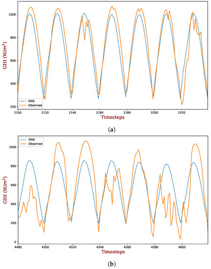 A machine learning method, random forest regression (RFR), is used in [26] to obtain three years ahead solar irradiance to quantify energy potentials. Four deep learning (long short-term memory cells (LSTM), gated recurrent unit (GRU), recurrent neural networks (RNN), feed forward neural networks (FFNN)) and one machine learning (support vector regression (SVR)) models were implemented and compared in [27] to predict one year ahead hourly and daily solar radiation. According to their results, the state-of-the-art models outperformed the traditional one they use for benchmark (RFR). The autoregressive integrated moving average (ARIMA) model was compared with RFR, neural networks, linear regression, and support vector machines in [28]. The results suggest that the ARIMA model performs better than the other approaches. A comparison between only deep learning models is presented by [29]. Seasonal ARIMA has also been applied to study GHI short-term forecasting [30]. In that work, GRU is proposed for forecasting one year of hourly and daily solar radiation with a performance better than LSTM, RNN, FFNN, and SVR. Finally, transfer learning has also been employed to address geographical spaces where there is a shortage of previous data, and it results in being too expensive or complex to collect by refining trained recurrent neural network-based models at other locations with abundant data [31]. Among the mentioned works, the use of RNNs is of particular importance.
