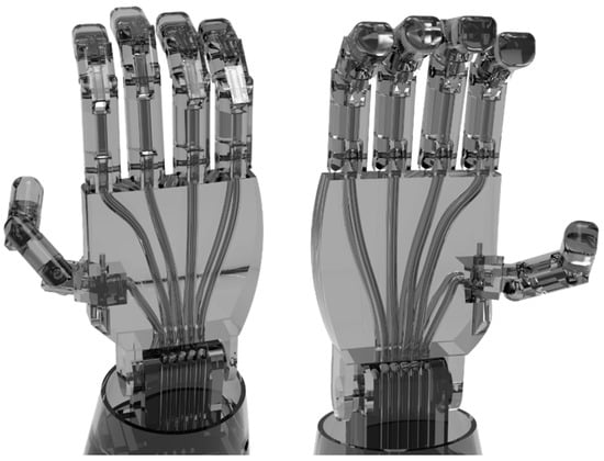During the CAD design, the basic rules for creating parts for trouble-free and support-free FDM 3D printing were strictly followed (e.g., the 45-degree rule). The prosthesis’s main control wires can be hidden in the smooth guiding channels produced by 3D printing. These channels are shown in Figure 2.