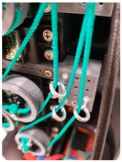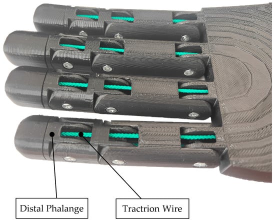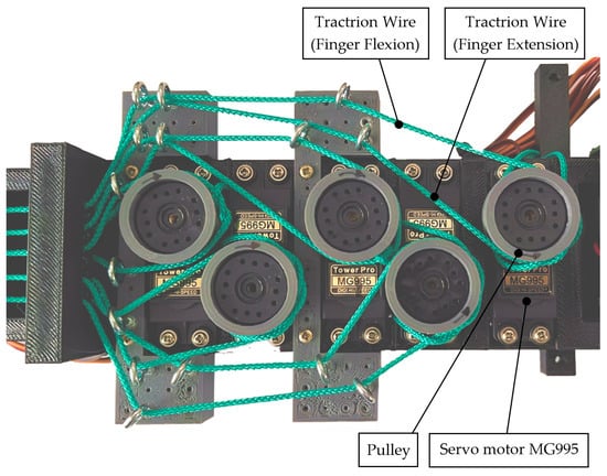 A set of two individual traction wires manufactured from polypropylene with the trade name PPV 1 controls the finger movements. One controls the flexion of the finger, while the other controls its extension. Figure 3 and Figure 4 show the connection of traction wires between the control servo motor and the last segment of each finger (distal phalange).