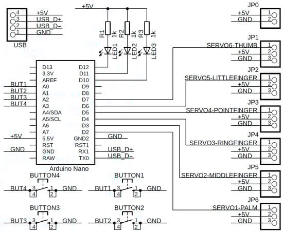 The Arduino platform, namely the Arduino Nano R3 and its ATmega328P microcontroller, served as the basis for the electronic design of the prosthetic hand. The mainboard was chosen for its low price, simple design, and sufficient input and output ports. Additionally, it runs on 5 V and includes 6 PWM (pulse–width modulation) outputs, which are appropriate for connecting servomotors and external communication by USB.