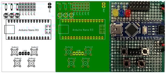 The electronics were designed in SW Eagle and Fusion 360 (both Autodesk) specifically for free personal use. The final design of the custom printed circuit board was realized using a universal prototyping board with manual placement and soldering. The entire process of design, visualization and final production of a custom board is shown in Figure 7.
