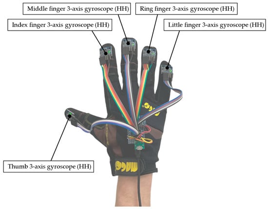 In total, there are six MPU-6050s, one for each finger and one for the reference point placed on the back of the hand. The main program periodically checks the actual angle between the MPU-6050 placed on the finger and the reference MPU-6050 placed on the back of the hand. The subtraction of these angles gives the intended angle of each finger. The described glove is shown in Figure 8.