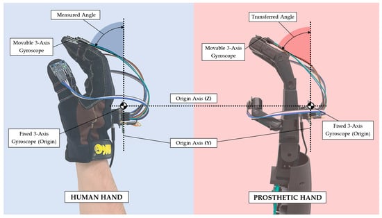 The principle of measuring and transferring the angle (from the hand/glove to the prosthesis).