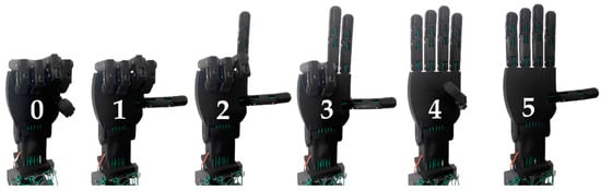Figure 10 displays the finger counting executed on the prosthetic hand. Over the course of 30 days, the prosthesis performed 100,000 uninterrupted cycles of this continuously repeating counting sequence. After the test sequence was finished, the prosthetic hand was remeasured in the same way—with the same angle settings of each distal phalanx at 0, 40, and 80 degrees.